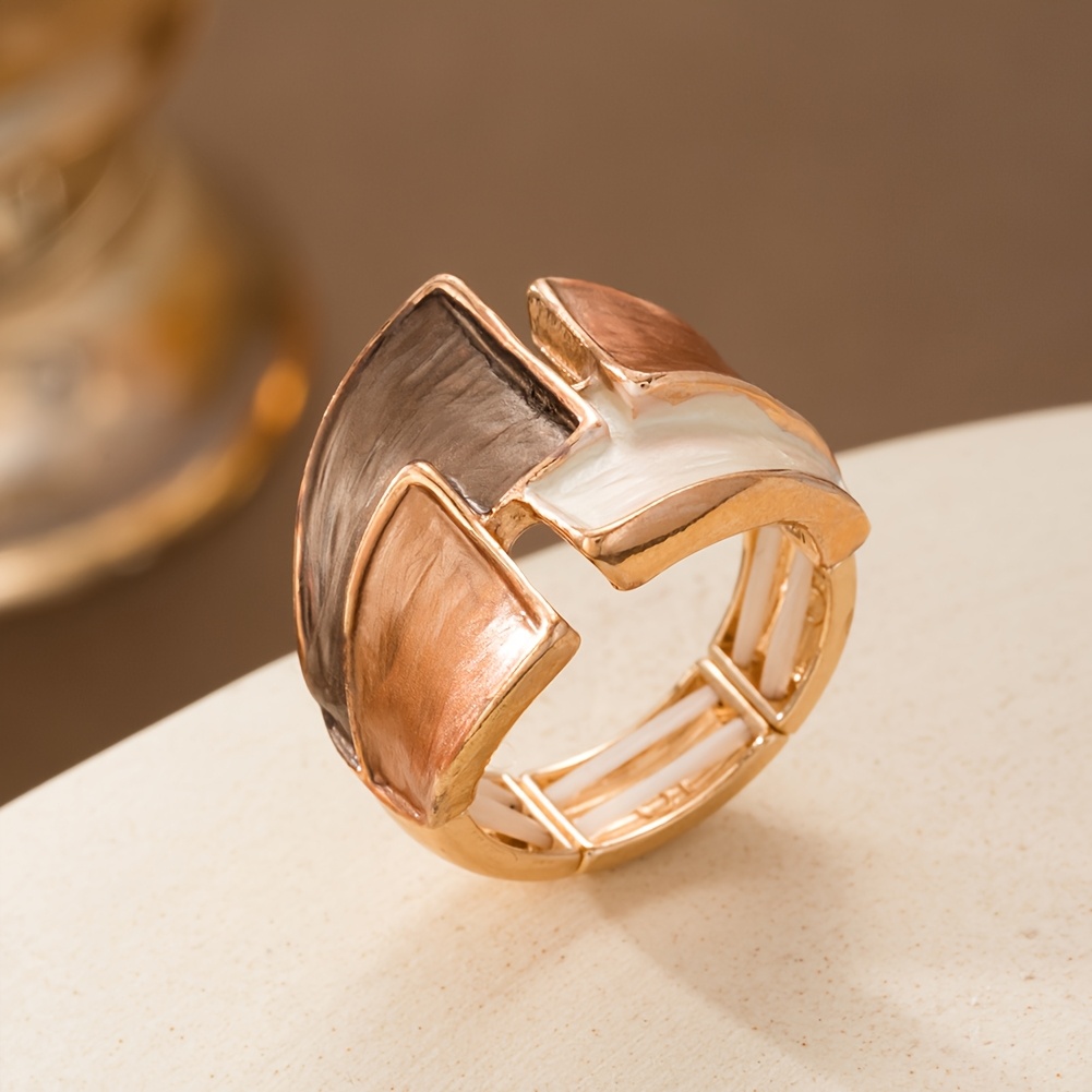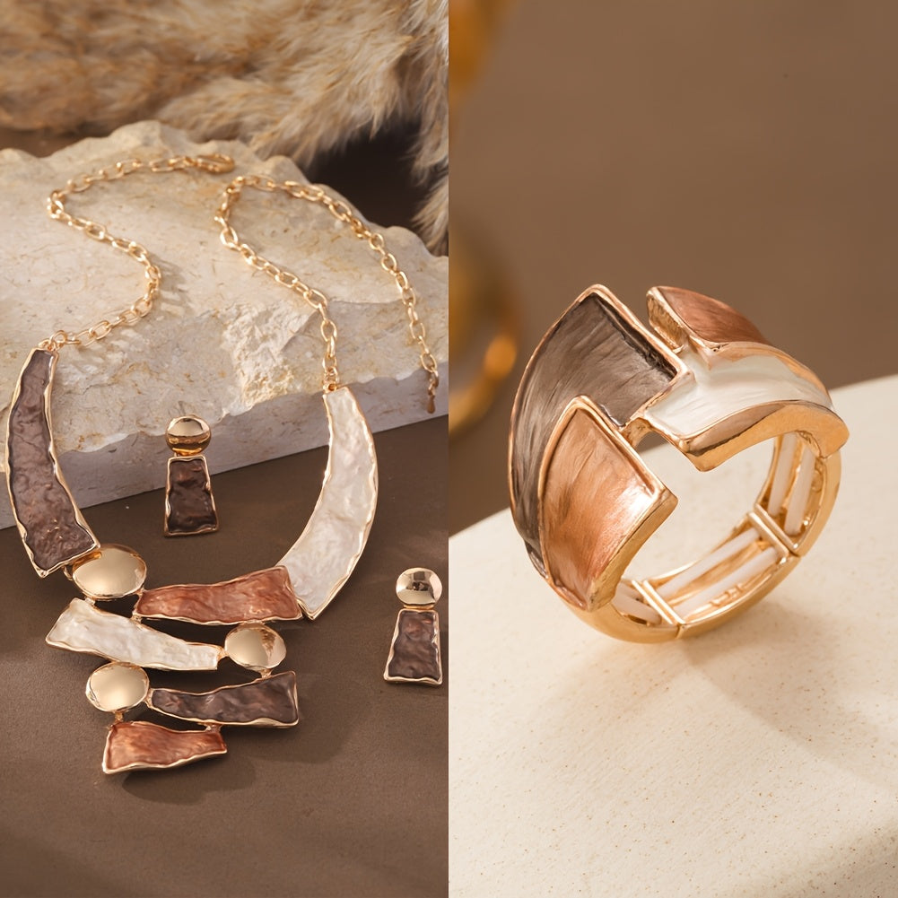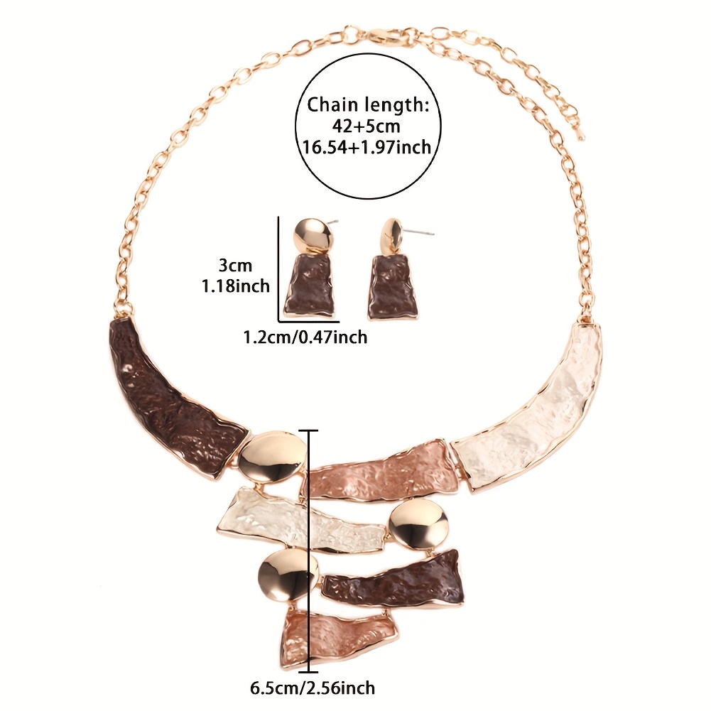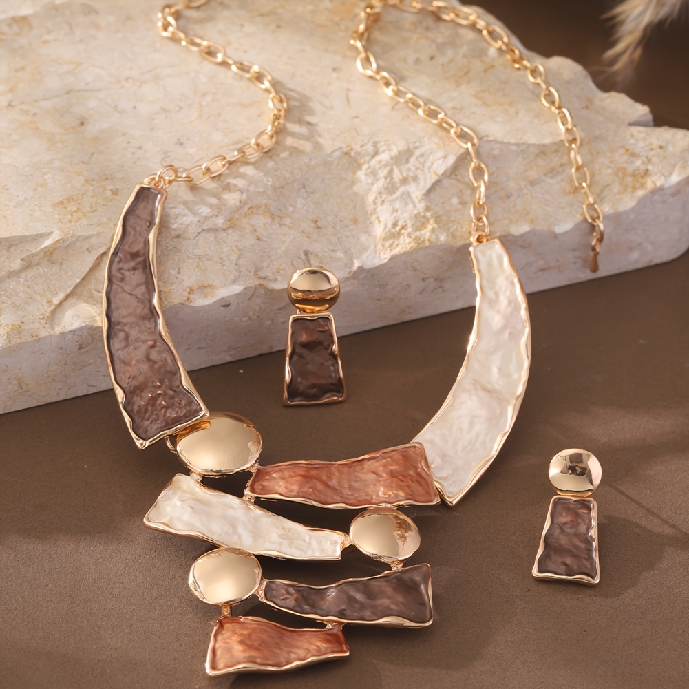 💫 3'lü Geometrik Desenli Takı Seti – Küpe, Kolye ve Yüzük Üçlüsü - Kahverengi